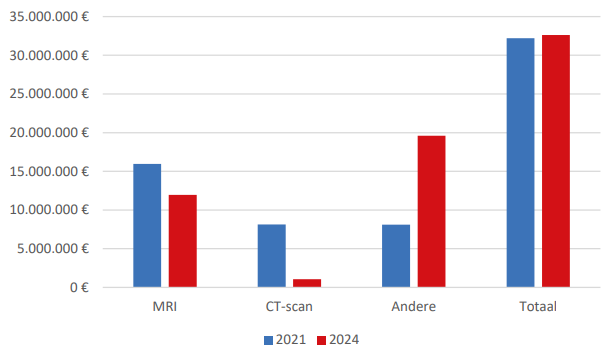 Tegelijkertijd zijn ereloonsupplementen voor andere types ambulante medische beeldvorming, uitgevoerd door een radioloog in een ziekenhuis, sterk gestegen, van 8 miljoen euro in 2021 naar bijna 20 miljoen euro in 2024. Om die reden is het totaalbedrag van de ereloonsupplementen niet gedaald.