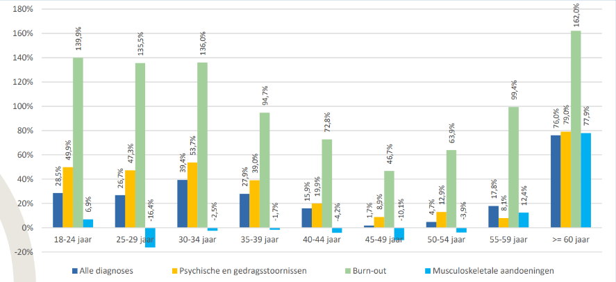 In 2024 was 39 procent van de nieuwe arbeidsongeschiktheden bij 18- tot 34-jarigen het gevolg van psychosociale aandoeningen zoals burn-out, depressie, stress of angststoornissen, tegenover 30 procent bij 35-plussers. Sinds 2018 nam hun aandeel met bijna 35 procent toe, tegenover 20 procent bij de oudere leeftijdsgroep. Musculoskeletale problemen namen in beperktere mate toe.